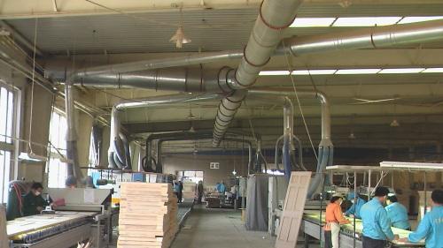 生產(chǎn)中產(chǎn)生的粉塵被吸塵風(fēng)管管收集后,經(jīng)調(diào)節(jié)碟閥、進風(fēng)管進入木工除塵器,粉塵被阻留在濾袋外,干凈的氣體經(jīng)濾袋、引風(fēng)機、煙囪達標(biāo)排放至大氣。家具廠除塵器收集的粉塵埋刮板輸灰機輸送至料倉,通過料倉卸料口經(jīng)鋸末壓塊機自動壓塊。