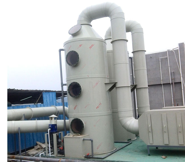 廢氣源→高效吸收塔(吸收掉粉塵以及顆粒物為光催化提供優(yōu)良的運(yùn)行環(huán)境。酸霧廢氣,由吸風(fēng)罩、吸風(fēng)管收集通過引風(fēng)機(jī)鼓入凈化塔內(nèi)由下向上流動(dòng), 通過一級(jí)噴淋的吸收液接觸反應(yīng),吸收不完全后的廢氣繼續(xù)向上流動(dòng)至三級(jí)噴淋的吸收液繼續(xù)接觸反應(yīng)。使氣液兩相充分接觸,)→光催化氧化處理設(shè)備(破壞廢氣分子結(jié)構(gòu),轉(zhuǎn)化為無污染物質(zhì))→高壓風(fēng)機(jī)(高壓的吸力作用下將風(fēng)抽出車間)→煙囪高空排放(也可低空排放)。